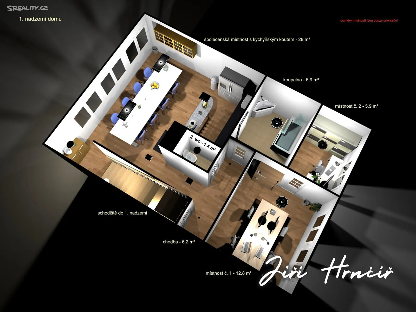 1.nadzemní podlaží: vstupní chodba, technická místnost, koupelna, samostatné WC, dva pokoje, prostorný obývací pokoj s kuchyňským koutem 2. nadzemní podlaží: chodba, prostorný obývací pokoj s kuchyňským koutem, dva samostatné pokoje, koupelna, WC, komora 3. nadzemní podlaží, velký otevřený obytný prostor, kuchyňský kout, technická místnost s umyvadlem a přípravou na instalaci WC